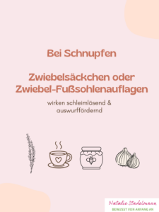 Zwiebelsäckchen oder Zwiebel-Fußsohlenauflagen wirken schleimlösend & auswurffördernd. Die Zwiebel dafür am besten gitterförmig einritzen oder klein schneiden, vor der Anwendung sanft erwärmen. Um den Geruch etwas abzumildern können sie mit einem Tropfen ätherischem Lavendelöl (von Lavandula angustifolia) kombiniert werden.