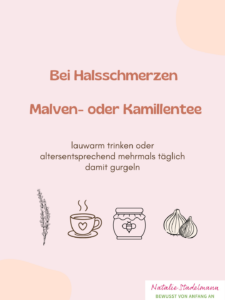 Malven- oder Kamillentee wirken reizlindernd & beruhigend und sind dabei mild im Geschmack – ideal für Kinder. Am besten lauwarm trinken oder altersentsprechend mehrmals täglich damit gurgeln.