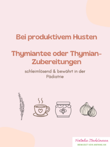 Thymiantee oder Thymian-Zubereitungen wie Hustensäfte, sie sind schleimlösend & bewährt in der Pädiatrie. Besonders effektiv wirken Thymian-Zäpfchen, die deine Apotheke für dich herstellen kann. Tipp: Bevorzuge bei Kindern immer den verträglicheren Thymian CT linalool.